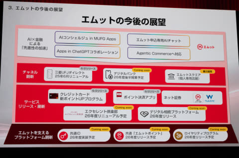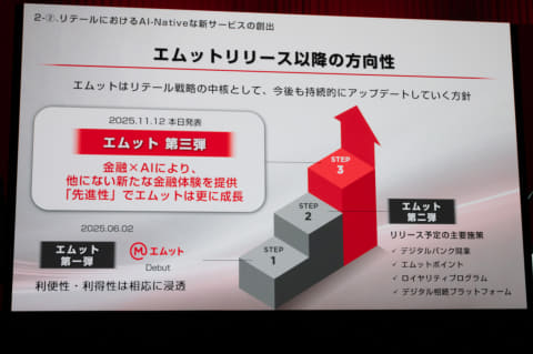 こうしたエムットの展開は「第一弾」の内容にあたる。第二弾の展開は、2026年度のデジタルバンク開業のほか、2026年度後半のエムットポイントの導入、ロイヤリティプログラムの導入、デジタル相続プラットフォームの導入など。これらはエムットのサービス発表時に案内されている。また、富裕層向けエクセレントクラブの全面リニューアルも検討中としている。