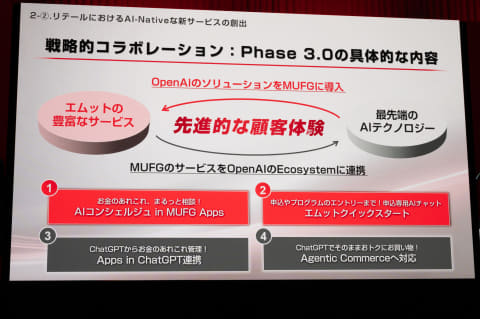 エムットの第三弾の展開は、上記で方針が明らかにされた「金融×AI」の取り組み。エムット第三弾のカギになるのが、OpenAIとの戦略的コラボレーションのフェーズ3としている。