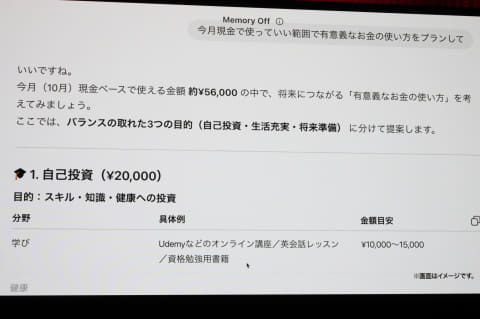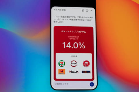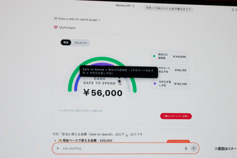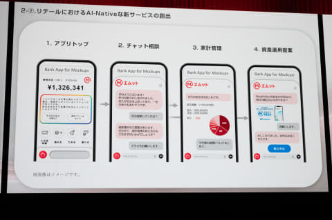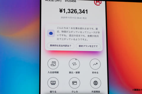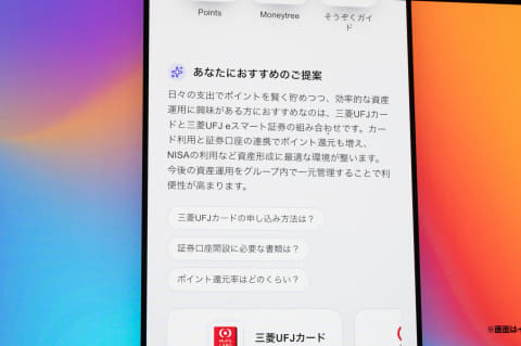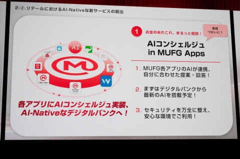 「AIコンシェルジュ in MUFG Apps」は、グループ各社のアプリにAIを搭載し、質問への回答にとどまらないパーソナライズされたサポートを行なうというもの。例えば、口座の支出内容を分析して傾向や予測が案内されるほか、内容に応じたポイントアップの方法なども提案される。将来的には各アプリのデータが統合され、AIが取引全体を把握し的確な提案をできるようにする。