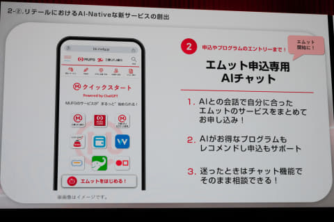 「エムットクイックスタート」は申し込み専用AIチャットで、MUFG各社の口座開設やサービスの申し込みについて、丸ごとAIがサポートするというもの。要望に合ったサービスを提案するほか、特設ページの閲覧状況などからレコメンドを“生成”。初めてのユーザーにも分かりやすい内容にする。
