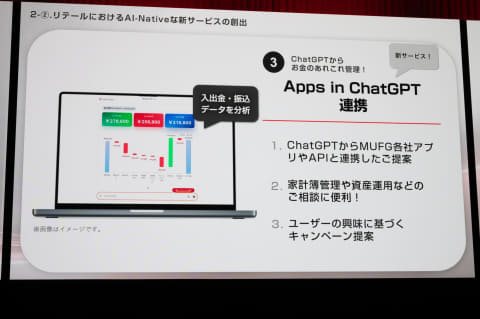 「Apps in ChatGPT」連携は、OpenAIが10月に発表したばかりの機能。ユーザーがあらかじめ連携設定することで、従来のWebブラウザから利用する「ChatGPT」が、バックグラウンドでMUFG各社のアプリと連携する。