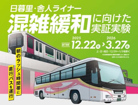 日暮里・舎人ライナーの混雑緩和に向け、12月22日から26年3月27日までの平日朝に、日暮里・舎人ライナーと同ルートの貸切バスが運行される。東京都交通局と足立区が連携して行なう実証実験で、通勤・通学定期券所有者や東京都シルバーパス所有者等が無料で利用できる。乗車には専用の「利用者証」の提示が必要で、定期券等のみでは乗車できない。