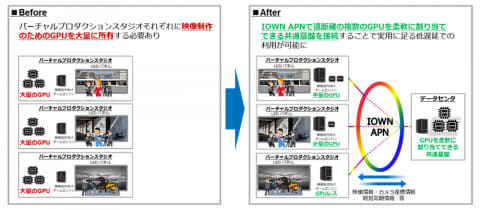 今回の取り組みでは、従来同一拠点内に設置していた映像制作向けGPUを、柔軟に割り当てできる遠距離にある拠点の共通基盤に設置し、IOWN APNで接続。リモート化に伴うさまざまな拠点間のデータをIOWN APNにより低遅延で伝送できることを確認。