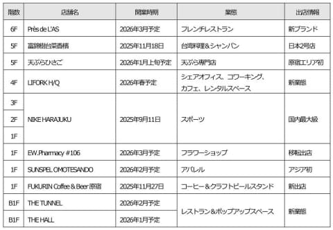 11月18日に台湾料理&シャンパン「富錦樹台菜香檳」(5階)、11月27日にコーヒー&クラフトビールスタンド「FUKURIN Coffee & Beer 原宿」(1階)がオープン。その後、1月に天ぷら専門店「天ぷらひさご」(4階)、レストラン&ポップアップスペース「THE HALL」(地下1階)など、順次オープンする。