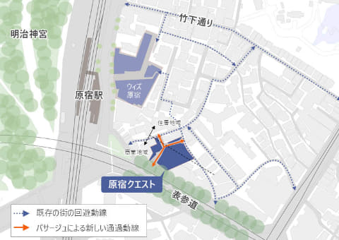 原宿クエストは地上6階・地下2階の高層棟と、地上1階の低層棟で構成され、両棟の間にはパサージュ(敷地内通路)を設けている。表参道からは、パサージュを通じて地上階および地下階の店舗へ直接アクセスできる。