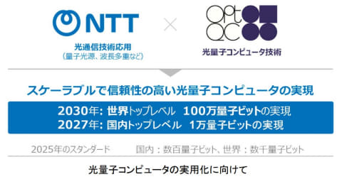 今回の取り組みではNTTの光通信技術と、OptQCの光量子コンピュータ開発技術を融合。スケーラブルで信頼性の高い実用的な光量子コンピュータの実現を目指す。具体的には、量子コンピュータの実用性の指標となる100万量子ビット規模のスケーラビリティと、信頼性を担保する誤り耐性技術の確立を、2030年までに達成することを目指していく。