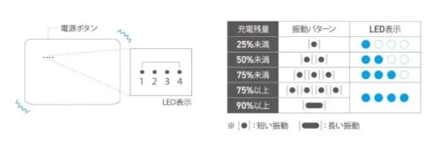 電池残量や充電状況を振動で知らせる「触覚フィードバック」を搭載。ボタンを押すと、振動でバッテリー残量を通知する。振動パターンは5種類。目視によるLEDランプの確認が不要で、バッグの中に入れた状態でも操作可能。ケーブルの接続ミスなども振動で知らせ、視覚に頼らずに安心して利用できる。