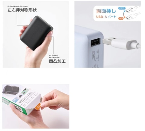 操作性を高めるため、ボタン周囲には凹凸加工を施し、触れるだけで位置を判別可能。本体は左右非対称の形状で、USBポートの配置も直感的に把握できる。USB Type-CポートとUSB-Aポートを各1基備え、USB-Aポートは両面挿しに対応する。