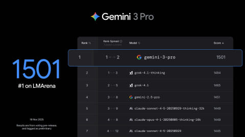 Googleは、Gemini 3 Proは主要なベンチマークテストでGemini 2.5 Proを上回っているのはもちろん、AIモデルの性能を比較する公開プラットフォームである「LMArena」で1501ポイントを獲得、他のAIモデルより優れている、と説明している。