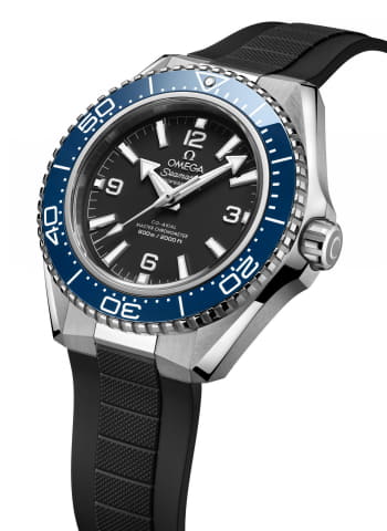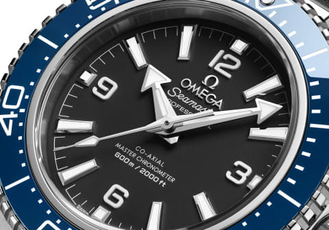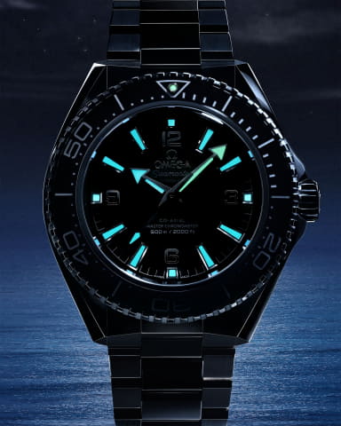 新型プラネットオーシャンのダイヤルは、すべてマットブラックで統一される。アロー針やスーパールミノバの力強いインデックスを継承しながら、アラビア数字はオープンワークで角張った形状にリニューアルされた。オメガのロゴはロジウム仕上げになる。
