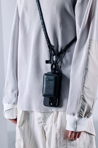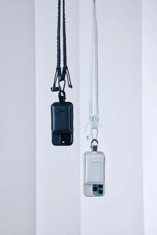 iPhoneケース「デタッチャブルストラップ + iPhoneケースセット ダイニーマ レザーウォレット」は、objcts.ioのMagWearシリーズを、meanswhileのデザイナー・藤崎尚大氏が再解釈。ストラップとウォレットがセットになっており、「命綱」「落下防止具」として発展したバンジーリーシュコードを製品に採用し、スマートフォンと身体を接続するイメージを体現した。