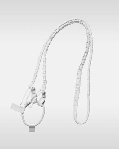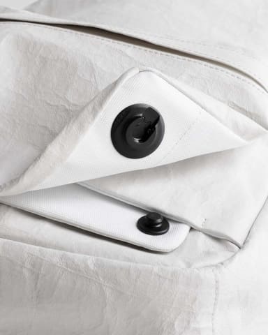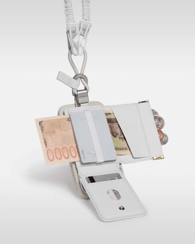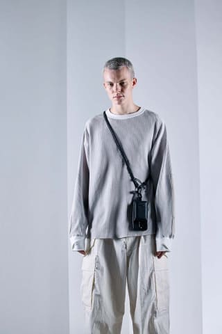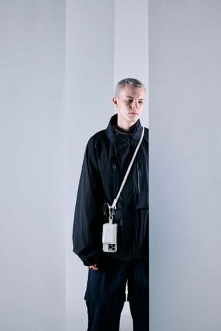 「持ち運ぶ」を「纏う」という行為へ進化させ、ファッション性のあるプロダクトに仕立ている。ストラップ表面のシワ感がスタイルのワンポイントにしており、タグ部分には相互のブランドロゴを素押しであしらった。