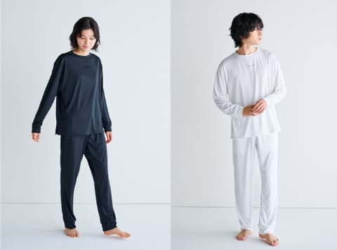 肌が最も水分を失う夜間に着目した疲労回復ウェア。同社が夏のビジネスウェアで培ってきた快適さの知識や経験と、協力会社が敏感肌向けに開発した繊維「NANOMIX」を応用し、独自の「肌保温機能繊維」を使用している。