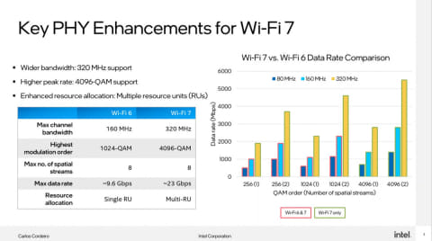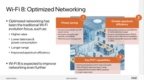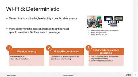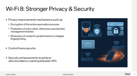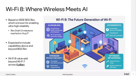 Intelは、IEEE(米国電気電子学会)が現在策定中の無線LAN規格「Wi-Fi 8」について、説明会を行なった。Wi-Fi 8はIEEE 802.11bnに準拠する次世代無線LAN規格で、同社はこれを「Connectivity for the Ai Era(AI時代のための接続性)」と位置づけ。通信速度や帯域幅は既存のWi-Fi 7と変わらないが、接続性の向上や消費電力、セキュリティなど、AI技術を活用しながら大きく改善し、高い信頼性を実現するという。2027年末~2028年初頭頃に提供が開始される予定。
