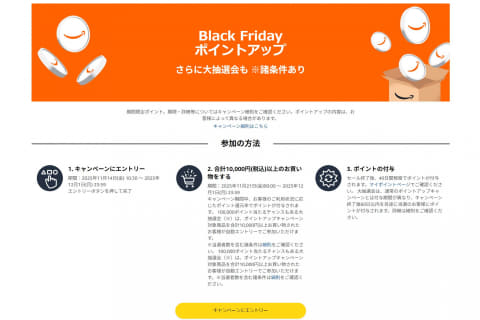 まずは、期間中にキャンペーンにエントリーし、1万円(税込)以上注文すると、Amazonポイント還元率がアップ。ポイントアップは21日からの先行セールも対象なので、忘れずにエントリーしておきましょう。