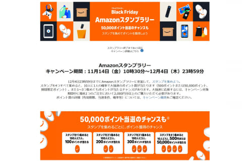 あわせて「Amazonスタンプラリー」開催中です。スタンプを4つすべて集めると、10人に1人の確率で大抽選のポイント賞が当たるもので、500ポイントまたは50,000ポイントの期間限定ポイントがあたります。キャンペーンのエントリーは12月1日23時59分まで。