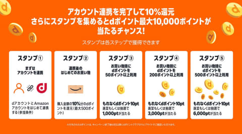 さらに「dポイント」でもスタンプラリーを実施中。キャンペーンにエントリーして、スタンプを集めることで、追加のdポイントが最大10,000ポイントもらえます。dアカウントとAmazonアカウントの連携が参加条件で、あとは初めての買い物で500ポイント、買い物時のdポイント利用で追加のポイント付与などが行なわれます。
