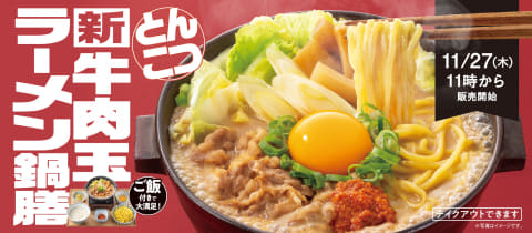 吉野家は、冬の期間限定新メニュー「牛肉玉ラーメン鍋膳(とんこつ)」を、27日11時より全国の店舗で発売する。価格は店内飲食が987円、テイクアウトが969円。ご飯の増量・おかわりは無料となる。