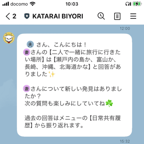 「会話のきっかけ」と「気持ちを伝える機会」の2軸で、パートナーとのコミュニケーションをサポートするサービス。LINEの公式アカウントに登録してパートナーを招待をすると、執事のメェープルくんが約1週間に一度のペースで2人に関する様々な質問を投げかける。2人が回答すると双方に共有され、お互いに関して新しい気づきや会話のきっかけを与える。