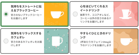 手紙はLINE上で記入したメッセージが印刷されて届く。ドリンクは4種類から選べ、甘さのないブラックコーヒー、カフェオレ、抹茶ラテやココアオレなどコーヒー以外のドリンク、カフェインレスから選択可能。