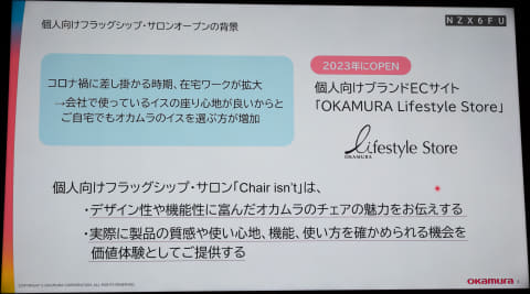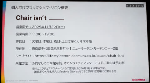 オカムラは、個人向けECサイト「OKAMURA Lifestyle Store」で取り扱うチェアやデスクを体験できるフラッグシップ・サロン「Chair isn't」(チェア イズント)を11月22日にオープンする。