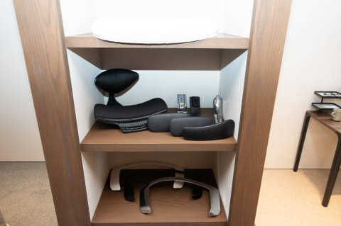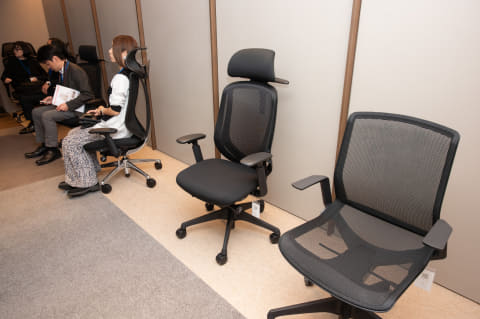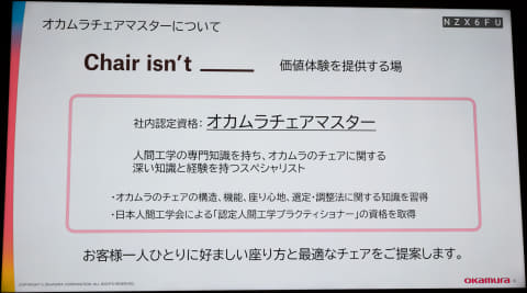 サロン「Chair isn't」は、試座だけでなく、「好ましい着座姿勢」をレクチャーしたり、チェアや姿勢の悩み相談に応じたりといった案内・提案も手厚くしているのが特徴。製品だけでなく、有資格者が正しい使い方も案内するという、オカムラがこだわるポイントをセットにしているのが特徴になっている。