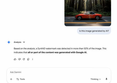 なお、Googleのツールで生成されたメディアには、目に見えないSynthIDデジタル透かしが埋め込まれる。20日からは、Geminiアプリに画像をアップロードし、Google AI が生成したものかを簡単に確認できるようになった。