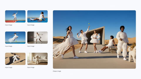 デザインの「一貫性」も強化し、最大14枚の画像を組み合わせて、最大5人までの人物の特徴や類似性を維持したまま画像を生成できる。ブランドのトーンとマナーに合わせたビジュアルをモックアップに簡単に適用し、一貫性をもった画像を作れる。