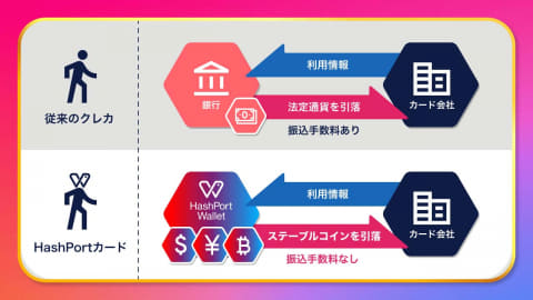 HashPortカードは、「HashPort Wallet」アプリと連携し、ウォレット内のデジタル資産をクレジットカードを介して決済に利用できるサービス。クレジットカードの利用金額は、通常のクレジットカードと同様に後払いとなる。デジタル資産をウォレット内に事前にロックしておく必要がなく、ステーブルコインでも支払いできる。銀行口座からの法定通貨での決済だけでなく、ウォレットからステーブルコインで後払いする体験を選べる点が最大の特徴。