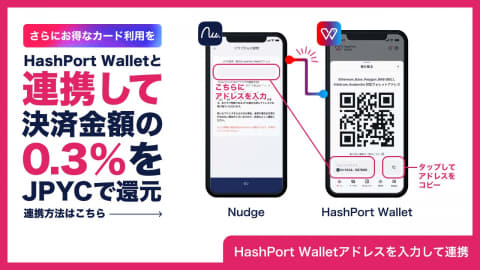 当初は、Nudgeがカードの発行とステーブルコイン(JPYC)での支払い受付から開始。26年1月には都度送付に加えて、HashPort Wallet内の残高から、利用額相当のステーブルコインの自動引き落としを設定可能とする。将来的には利用額相当のJPYCをガスレスで自動で引き落とす仕組みにも対応予定としている。