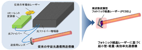 これまで同研究グループは、多数の複雑な光学素子からなる従来の宇宙用光送信機を、単一の半導体素子であるフォトニック結晶レーザーのみで置き換えられることを提示してきた。