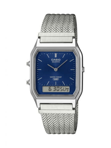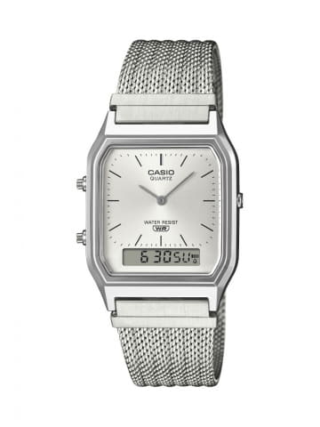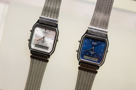 根強い人気のデジタルウォッチ「A158」と、角型フェイスにアナログ時計とデジタル表示を組み合わせた「AQ-230」に、メタル製メッシュバンドを組み合わせたのが特徴。バンドには縦方向のプレスが施され、立体感も加えられている。