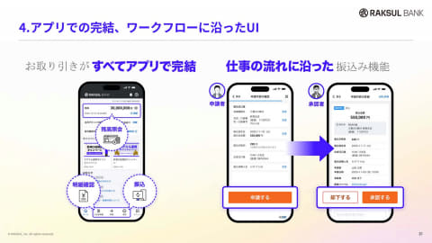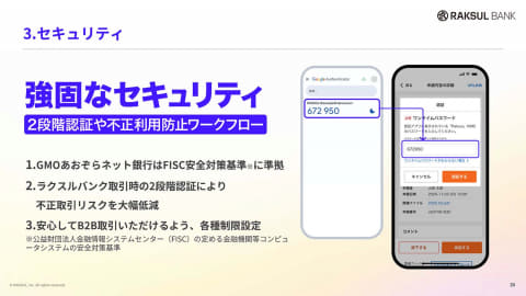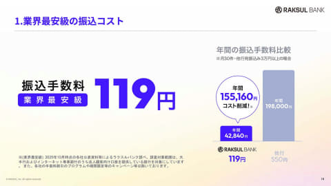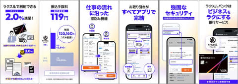 ラクスルバンクは、GMOあおぞらネット銀行との提携によるBaaS(Banking as a Service)を活用し、最短当日口座開設、他行宛て振込手数料119円/件、デビットカード決済で2%還元などの特徴をもつ銀行サービス。特に中小企業における使いやすさに注力し、開発した。運営会社となるラクスルバンクは、10月29日付けでGMOあおぞらネット銀行を所属銀行とする銀行代理業の許可を取得し、事業展開する。