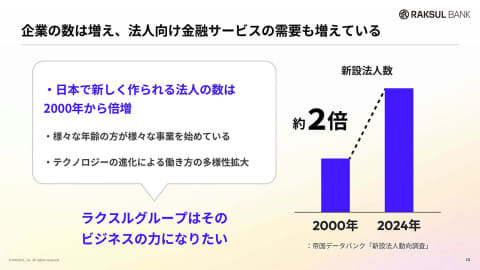 一方のBtoB金融は、法人金融では電子証明書の利用やオンラインバンキング営業時間などの不便、高い振込手数料などの課題があり、「テクノロジーの恩恵を受けられていない」(ラクスルバンク 杉山賢CEO)とする。こうした課題を、ラクスルバンクが解決するとともに、日本で作られる法人は増え続けていることから、1,000兆円の大きな市場に変化を起こしていけるとする。