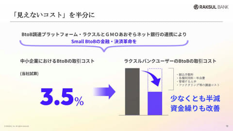 他行宛て振込手数料は119円/件で、「業界最安」と強調。従来の店舗型金融機関と比べて約40%以上のコスト削減が見込めるという。中小企業におけるBtoBの取引コストは3.5%に及んでおり、この中には振込手数料や各種利用料・年会費、人件費、ファクタリング等の調達コストなどがあげられる。ラクスルバンクを導入することで、これらを半減し、資金繰り改善に繋げられるという。