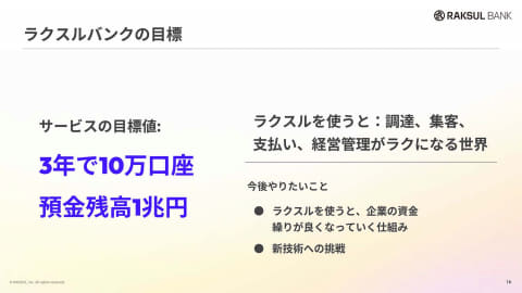 サービスの目標としては、3年で10万口座、預金残高1兆円を掲げる。この目標を達成すると、事業として独り立ちし、「印刷や広告に次ぐラスクルグループの三本目の柱になる」と説明。まずはラクスルユーザーの加入を促していくが、バンクサービス経由でのラクスルユーザー獲得も目指す。