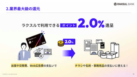 ポイント還元はデビットカード利用で2%で、ラクスルポイントを付与。出張や交際費、広告費の支払いなどでポイントを付与し、ラクスルにおける支払いに利用できる。