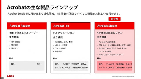 Adobeは12月10日、文書作業の効率化を支援する新プラットフォーム「Acrobat Studio」を提供開始する。価格は個人向けが月額3,300円(年間契約)、チーム向けは月額3,960円(年間契約)。7日間の無料トライアルも利用できる。