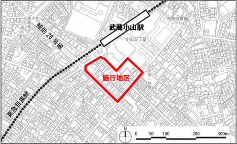 武蔵小山駅東口側にて計画されている「小山三丁目第1地区第一種市街地再開発事業」。施行地区は東京都品川区小山三丁目地内、地区面積は約1.4ha。