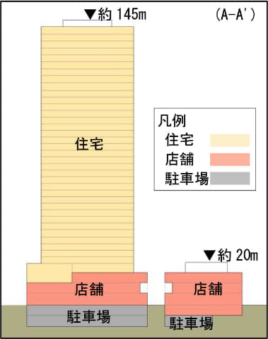 A-1街区、A-2街区で構成され、規模はA-1街区が地上39階、地下2階、高さ約145m、延べ面積約114,630m2、A-2街区が地上3階、地下2階、高さ約20m、延べ面積約9,220m2。A-1街区には住宅、店舗、駐車場、A-2街区には店舗、駐車場が整備される。