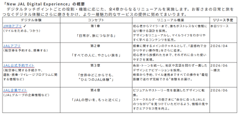 リニューアルスケジュールは、JMBアプリを皮切りに、26年4月にJALアプリ、26年6月にJAL公式予約サイトとJAL企業サイトを予定している。