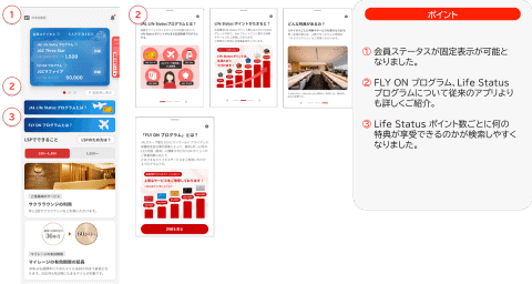 会員ステイタス設定時は、トップ画面に会員ステイタスが固定表示される、ユーザーからの「JAL Life StatusプログラムやFLY ONプログラムなど、会員ステイタスの仕組みが分かりにくい」という声を反映したリニューアルとなる。JAL Life Statusプログラムや、FLY ONプログラムも従来アプリより詳しく表示している。