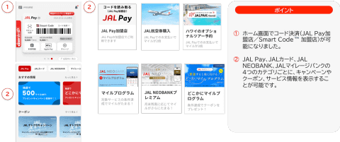 JAL Pay決済をホーム画面に設定すると、トップ画面でコード決済が利用可能になる。JALグループのキャンペーンやサービス情報についても、JAL PayやJALカードなど、サービスごとに検索ができるようになった。