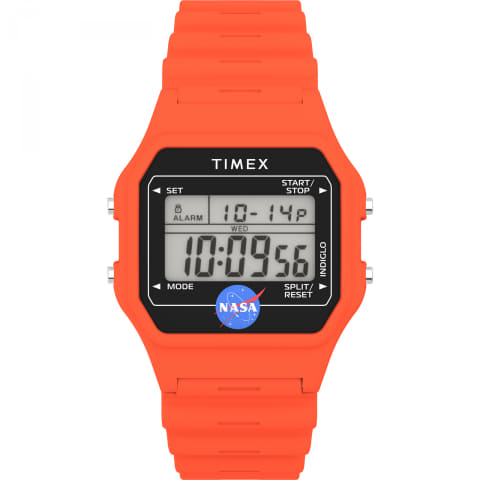 デジタルモデルは、軽量な樹脂製のケースに、宇宙服を思わせるオレンジと、ロケットの機体を想起させるホワイトの2種類のカラーを採用。暗所での視認性を高めるインディグロ ナイトライトや、カレンダー、アラーム、タイマーなど、日常使いに便利な機能を搭載する。