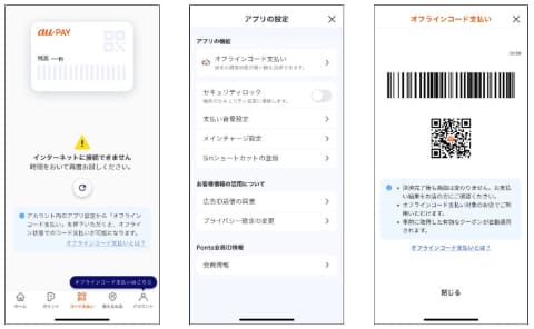 通信状態が悪い状況では、au PAYアプリのホーム画面にオフライン決済の案内が表示される。ユーザーはアプリ上で「オフラインコード支払い」画面を表示し、店舗側が表示されたコードを読み取る流れで決済を行なう。オフラインコード支払いでコード読取は利用できない。