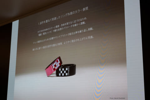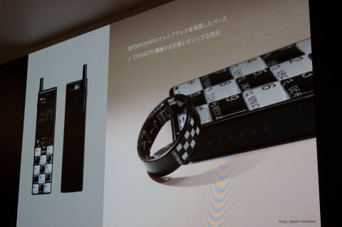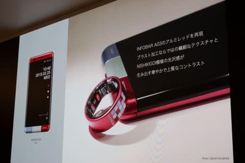 表面素材はステンレス。赤のNISHIKIGOIは「INFOBAR A03」のアルミレッドをモチーフにしたもので、ブラスト加工と模様部分のグロス塗りでコントラストを出している。なお、12月1日に報道陣に公開されたバージョンのNISHIKIGOIはアルミ合金製だったが、今後ステンレスに変更される見込み。黒のICHIMATSUは初代INFOBARの背面のマットブラックがモチーフになっている。