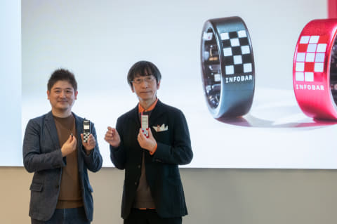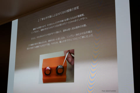 INFOBARコラボはKDDI側がデザインを監修。カラーや質感の忠実な再現にこだわり、十数回という試作を経て完成した。特徴的な模様部分は、最終的に手作業で色を塗る方式になったという。