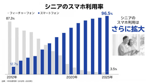 保険導入の背景には、シニア層のスマホ利用率の上昇とともにオレオレ詐欺被害も増えている実情がある。シニア層の携帯電話ユーザーにおけるスマホ利用率は年々上昇し、2025年には96.5%に達した。一方で、電話やスマホを介したオレオレ詐欺被害も増加しており、25年1~9月の被害総額は758億円と、前年同期比の3.3倍となっている。