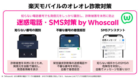 楽天モバイルではこれまでも、オレオレ詐欺対策を含む特殊詐欺を防止する対策として、知らない番号の発信元を自動識別し、詐欺の未然防止を図る「迷惑電話・SMS対策 by Whoscall」をオプションパックで提供してきた。