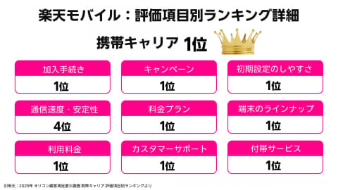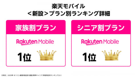 楽天モバイルは、2025年のオリコン顧客満足度調査における携帯キャリアランキングにて、9項目中8項目で1位を獲得し、3年連続で総合1位となった。同調査で新設された「シニア割プラン」部門でも1位を受賞し、シニア層からの支持も高い。